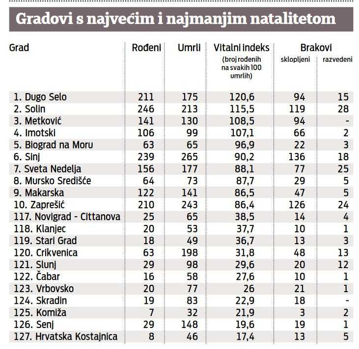 Među gradovima i općinama jedini se u pozitivi drže sateliti velikih gradova u kojima su troškovi života bitno niži nego u, primjerice, Zagrebu ili Splitu, a radna mjesta te obrazovni, sportski, kulturni i drugi sadržaji i dalje nadohvat ruke. Tako je hrvatski grad rekorder Dugo Selo, u kojem je broj rođenih 20% veći od broja umrlih (vitalni indeks 120), a slijedi Solin s 15% većim brojem rođenih. Na drugom su kraju ljestvice Hrvatska Kostajnica i Senj, u kojima je na svakih 100 umrlih osoba rođeno manje od 20 djece.