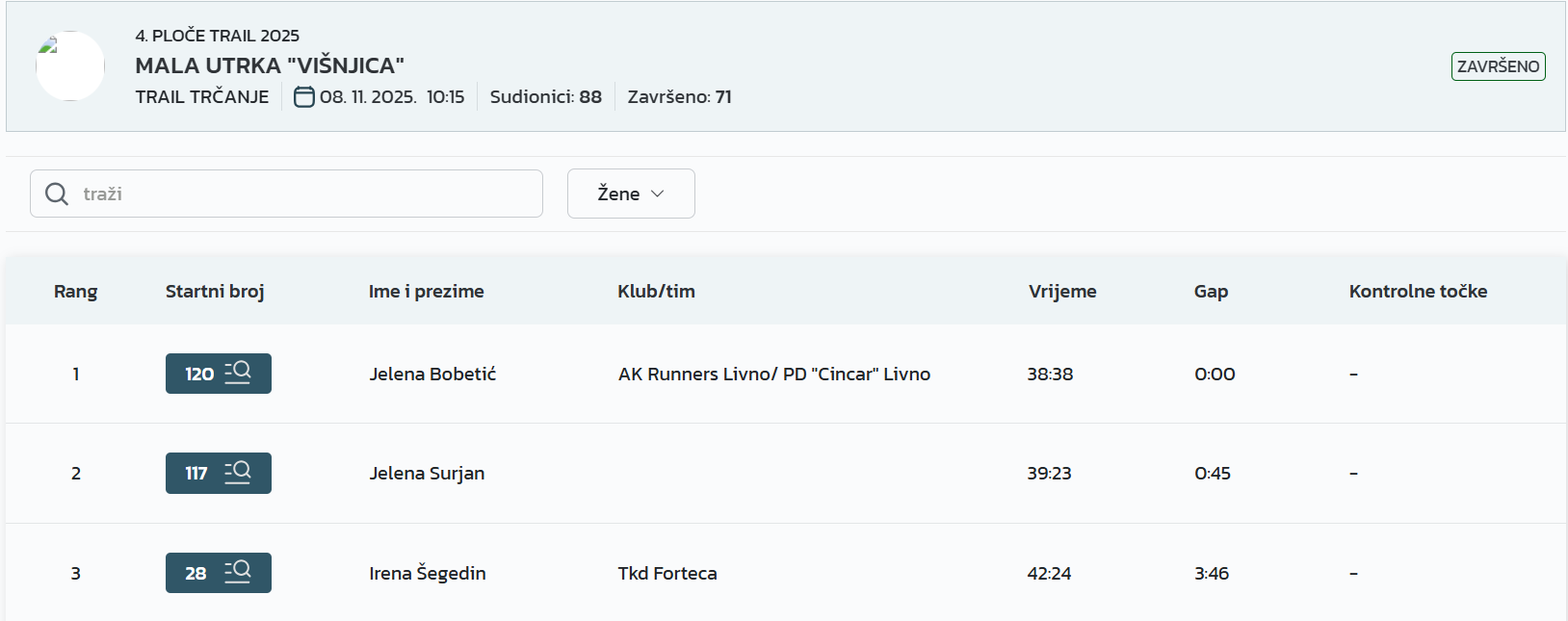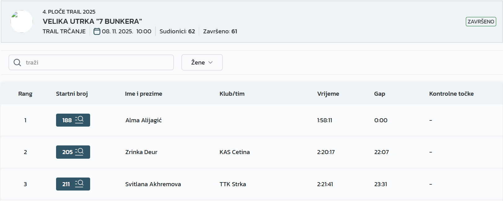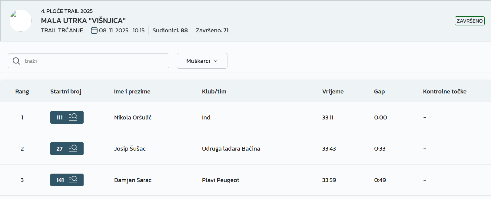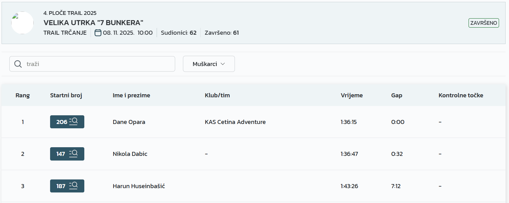 – Prvi put sam došao na Ploče Trail i oduševio se! Utrka je odlična, padova na sreću nije bilo, a uspon i spust su baš atraktivni. Očekivao sam da ću biti među prvih pet, tako da sam jako zadovoljan trećim mjestom. Vidimo se i dogodine! – rekao je Damjan.