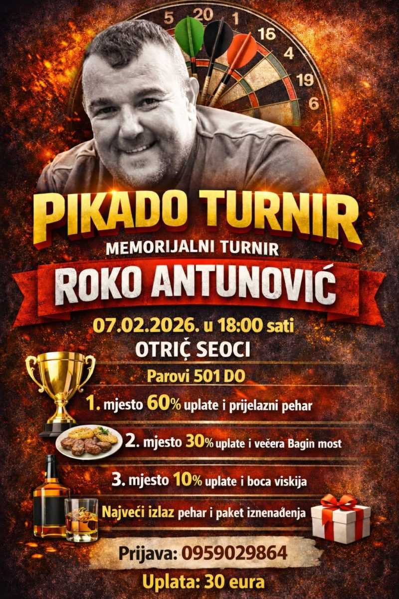 Pikado klub Pojezerje organizira memorijalni turnir Roko Antunović. Pozivamo pikado igrače i sve ostale da se okupimo u čast našeg prijatelja i suigrača.