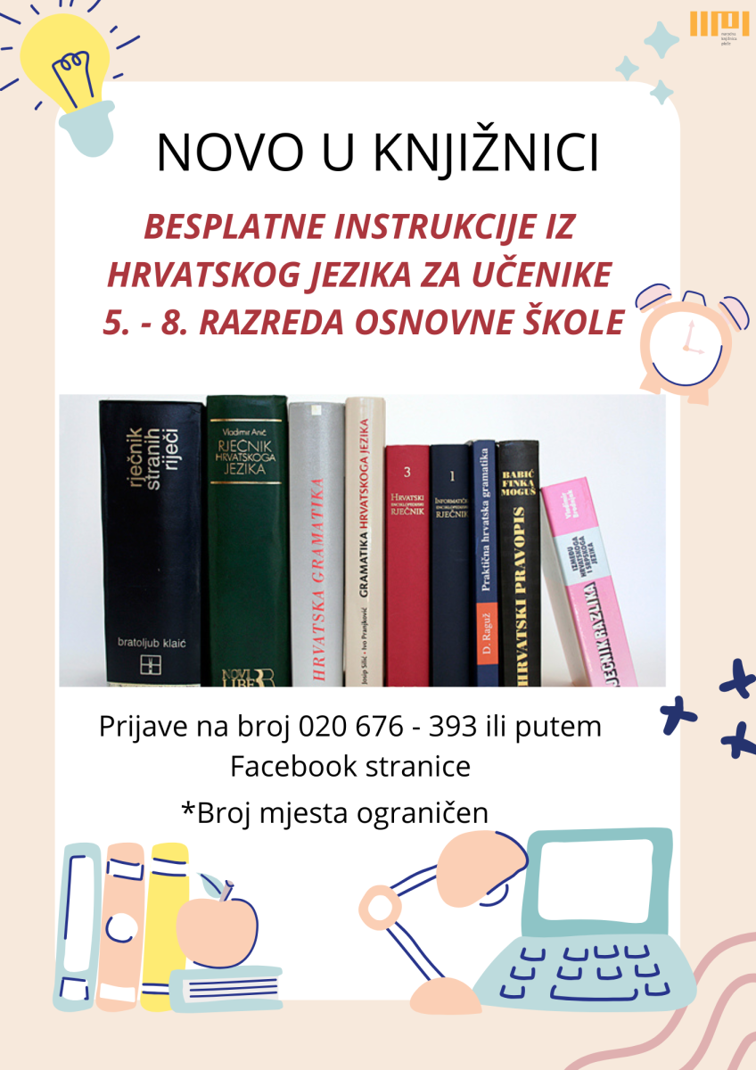 Narodnoj knjižnici uskoro započinjemo s održavanjem besplatnih instrukcija iz hrvatskog jezika za osnovnoškolce. Instrukcije su namijenjene učenicima kojima je potrebna pomoć u savladavanju gradiva, ponavljanju za testove, vježbanju pisanja sastavaka i boljem razumijevanju jezika i književnosti. Termini instrukcija bit će organizirani sukladno izmjeni školskih smjena.
